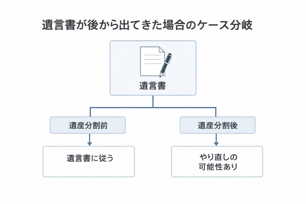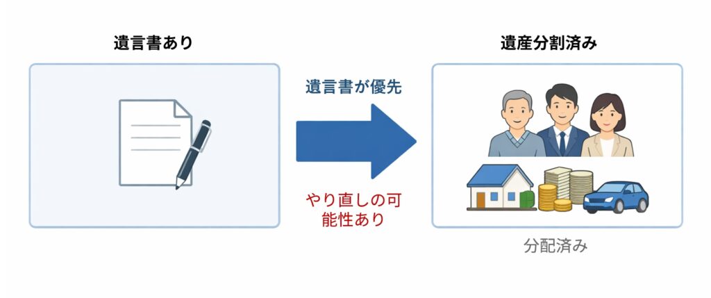 特に、遺言書の内容と異なる分割をしていた場合は、後から見直しが必要になるケースもあります。