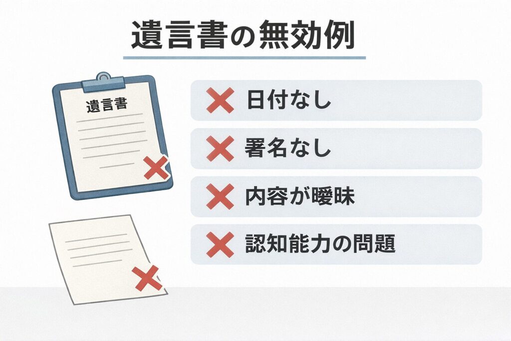 形式を満たしていても、遺言書の内容によってはトラブルや無効の原因になることがあります。
